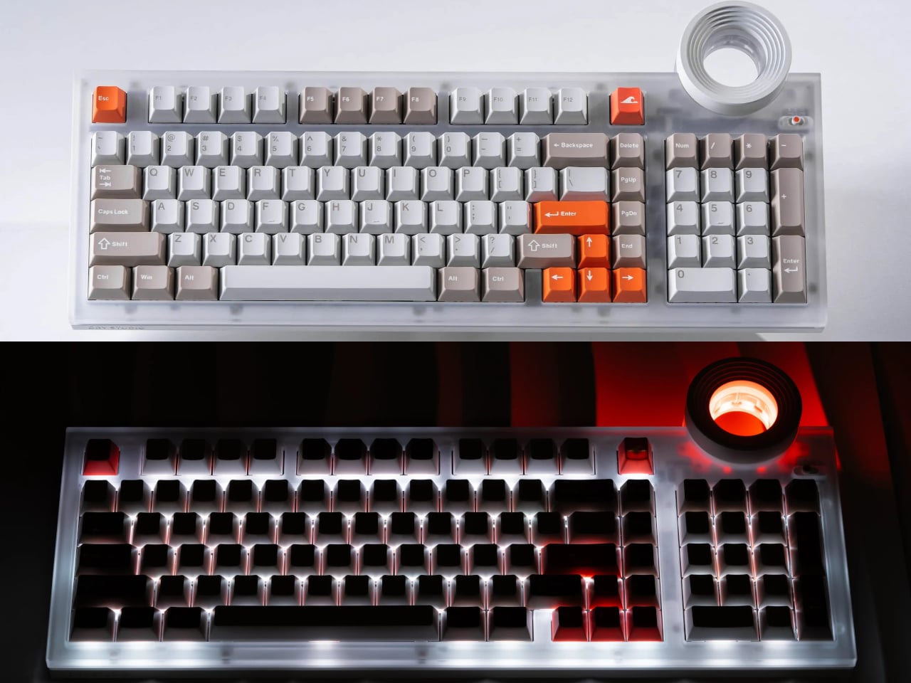 The design references are specific. One version channels Tadao Ando’s Church of the Light with a matte concrete-gray shell and controlled RGB lighting, treating the keyboard like a minimalist architectural object. The translucent Frost Whisper and Night Ink editions take inspiration from Off-White x Rimowa’s see-through luggage, revealing the gold-plated PCB and mounts underneath. The structure and lighting become part of the composition, not just decoration.