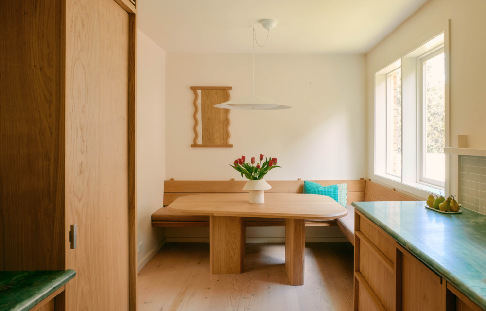 Broad pendant by Coco Flip. Mirror by Knot Studio. Dining table and joinery custom-designed and made by Taylor Made. Coco Flip pendant. Vase by Hero Knight Studio. Stone by Artedomus. Hardware by Studio Henry Wilson hardware. Upholstery by Jade Customs. Walls and ceiling painted Dulux Antique White U.S.A. Home of Alex Johnson of and Joel Taylor. Photo – Amelia Stanwix. Editorial styling – Annie Portelli