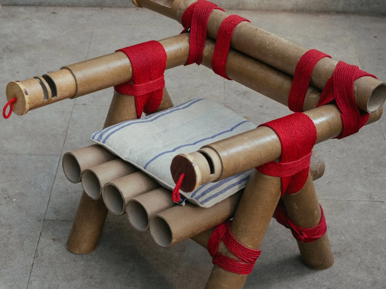 The Paper Tube Chair reframes design as a democratic act rather than a luxury pursuit. Conceived by the Dhammada Collective in Bhopal, founded by Nipun Prabhakar, it echoes Pierre Jeanneret’s library chairs yet replaces teak with discarded cardboard tubes. The studio advocates “joyful frugality”, applying strong design principles using overlooked materials so good furniture need not remain a metropolitan privilege. Cardboard cores from a print shop, destined for landfill due to glue layers that prevent recycling, are intercepted and cut like bamboo. Surplus vermilion rope from weaving workshops binds the tubes in a continuous figure-eight lashing that tightens under load and allows later repair.