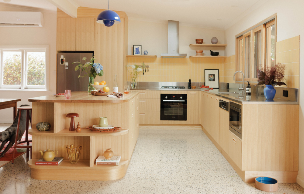 Inspired by the yellow sands and red earth of the Australian outback, she selected a butter yellow and terracotta palette for this Elwood kitchen renovation, transforming a kitchen with a ‘standard white laminate vibe’ into a space brimming with personality.