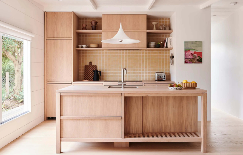Silvermoon Shack. Kitchen designed and built in American Oak by Gordon Johnson, with splashback tiles from Academy Tiles. 190mm wide oak floorboards in ‘buttermilk’ from Wood Coat Australia. Gubi pendant light from Surrounding. Tap by Sussex Taps from Reece. Painting by Marina Rolfe. Various ceramics by De Lunedi, Ella Reweti, Belinda Wiltshire via Makers Mrkt. Checkered chopping board by TS Makers. Photo – Eve Wilson. Editorial styling – Annie Portelli