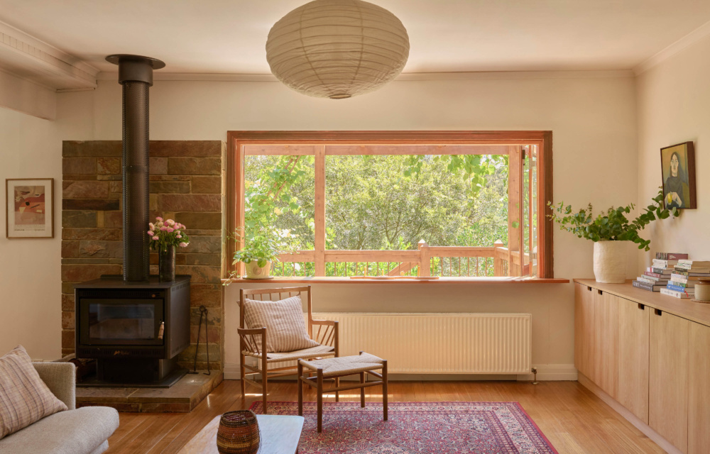 Sigrid and Trent’s relatively modest 1930s Eltham house has many quirks — there are no straight lines or even floors — but a charming new kitchen and renovated living areas by Peter have made it very liveable.