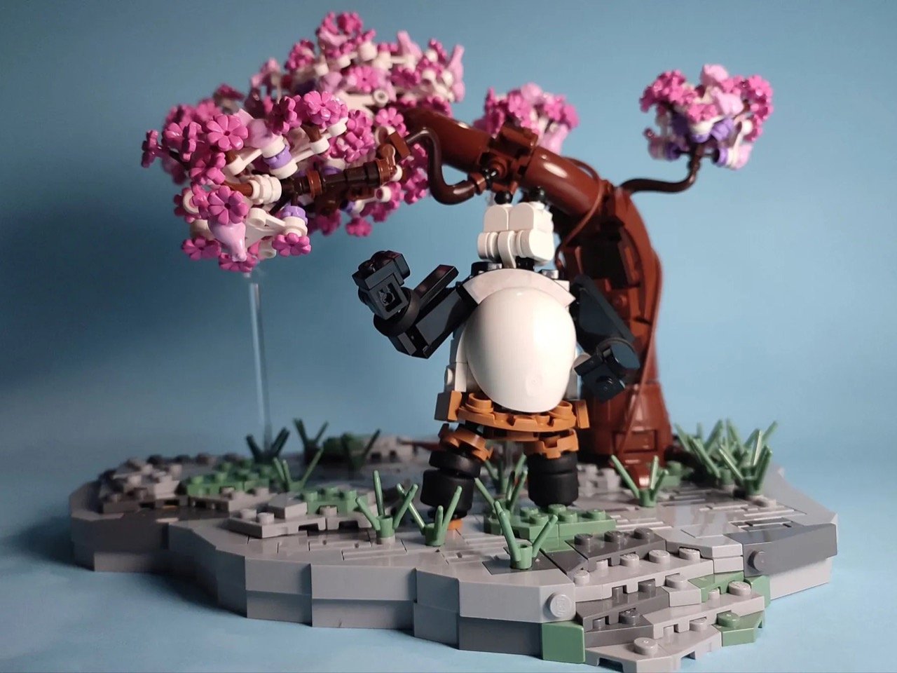 The LEGO MOC nails the scene’s composition with an almost uncanny accuracy, starting with the tree itself. The peach blossoms are crafted from clusters of small pink and white pieces, giving the canopy a soft, billowy appearance that mirrors the film’s dreamy animation. The trunk’s twisted, organic shape is achieved through a mix of curved brown bricks and plates, creating a sense of movement that makes the tree feel alive. Po’s minifigure is a standout, too, with a poseable design that captures his signature stance – arms akimbo, belly prominently rounded – while the rocky base uses layered gray and green plates to mimic the uneven, grassy terrain of the mountain. Even the tiny details, like the delicate green shoots sprouting from the rocks, add to the scene’s tranquility, making the whole build feel like a freeze-frame plucked straight from the movie.