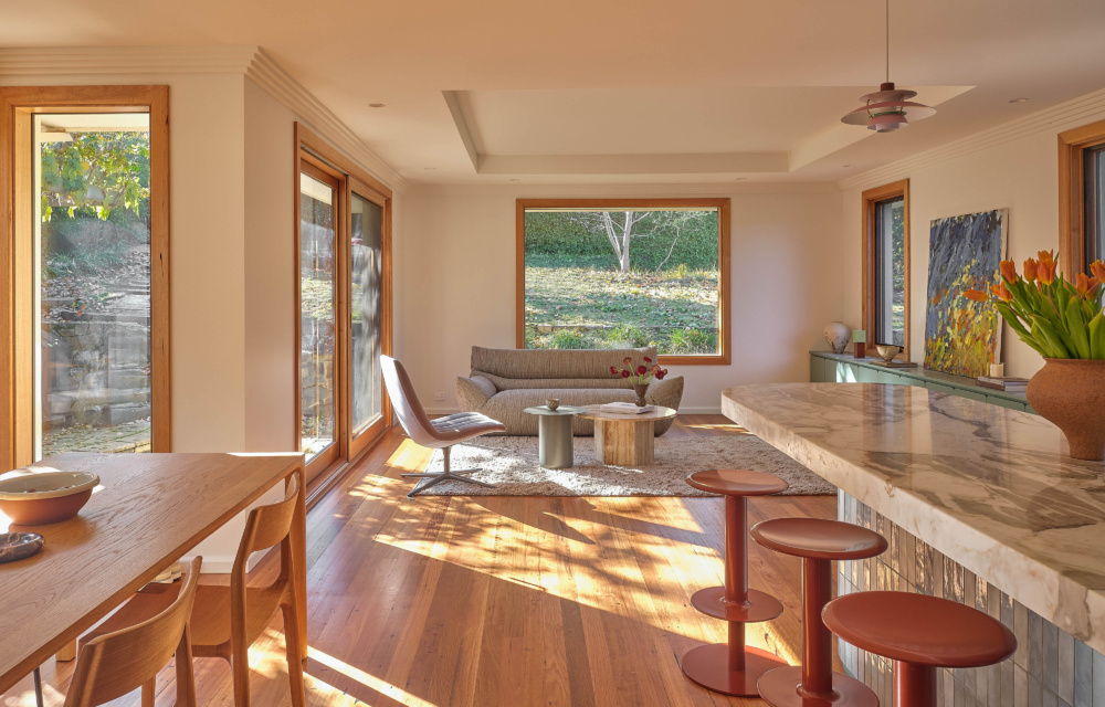 ‘The original home already sat comfortably within the street and landscape, so our focus was on enhancing its connection to the garden through reworked openings and improved indoor-outdoor flow, rather than altering its external presence,’ says Mark.