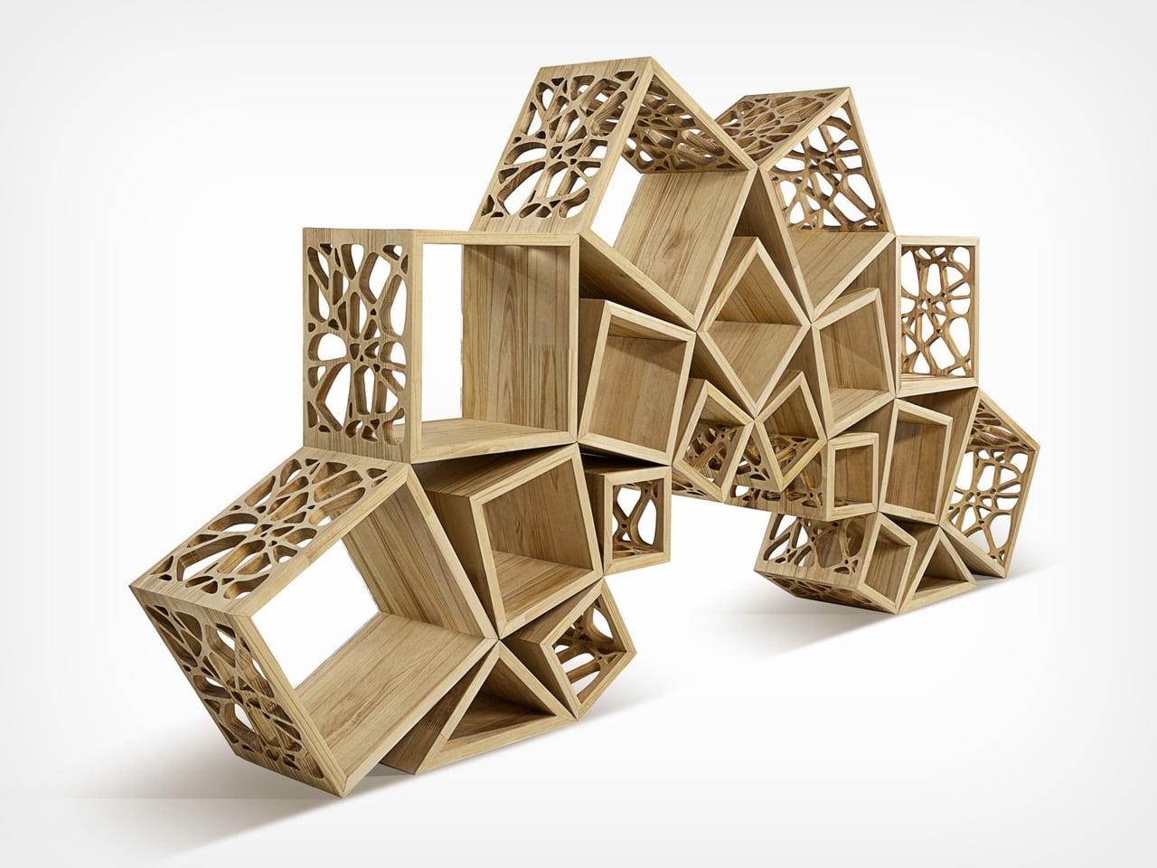 The design takes inspiration from fractal patterns found in nature, where forms repeat across scales while maintaining harmony and balance. This thinking informs the modular nature of the piece. Fractal 9 can function as a single integrated unit or be separated into two independent units, allowing it to adapt to different spaces and uses. Whether serving as a bookshelf, a display surface, or a sculptural centerpiece, the piece encourages interaction, experimentation, and creative reconfiguration.