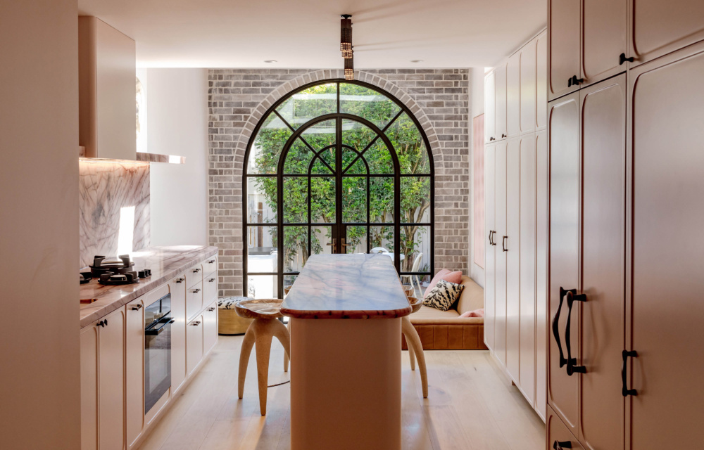 The pastel pink joinery and textural walls are contrasted with original period details, anchored by the steel-framed arched windows and ornate fireplaces.