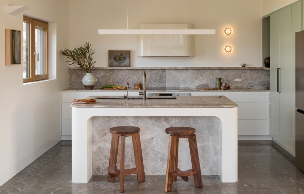 In the kitchen, it’s the richly veiled Luna Grigio marble island bench; the laundry has a checkerboard pattern of handmade tiles; and the bathrooms feature Fibonacci terrazzo and Mineral Fox microcement.