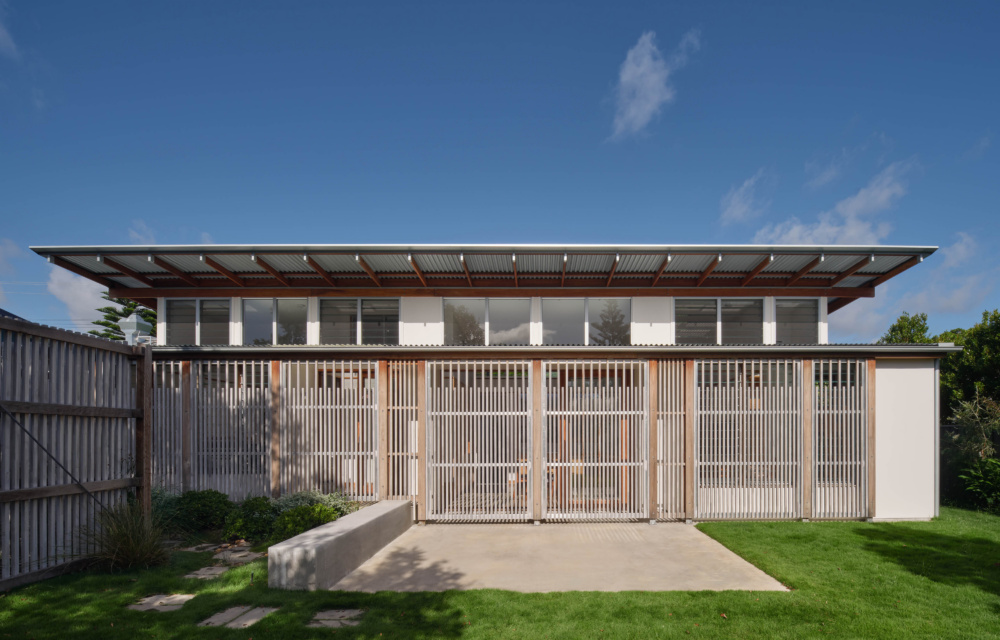 Robust materials were selected for the beachside home, including slatted screens fabricated from relatively lightweight thermally modified timber battens.