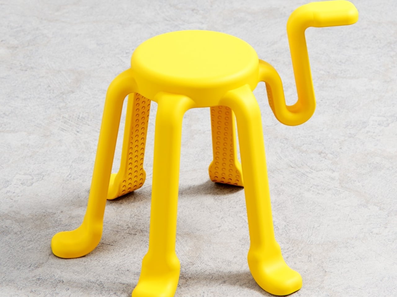 SQOOL is a 2025 personal project by Liam de la Bedoyere of Bored Eye Design, a UK-based independent studio that describes itself as creating work that’s anything but boring. At first glance, the stool reads almost like a creature. Six curved legs splayed outward with little rounded feet, a compact circular seat on top, and that one rogue arm reaching upward and curling into a hook. It looks like a cheerful yellow squid that decided to get into the furniture business, and I mean that entirely as a compliment. The photographs make it look alive. Depending on the angle, it shifts between dog, bug, and some friendly unnamed species you’d encounter in an animated film.