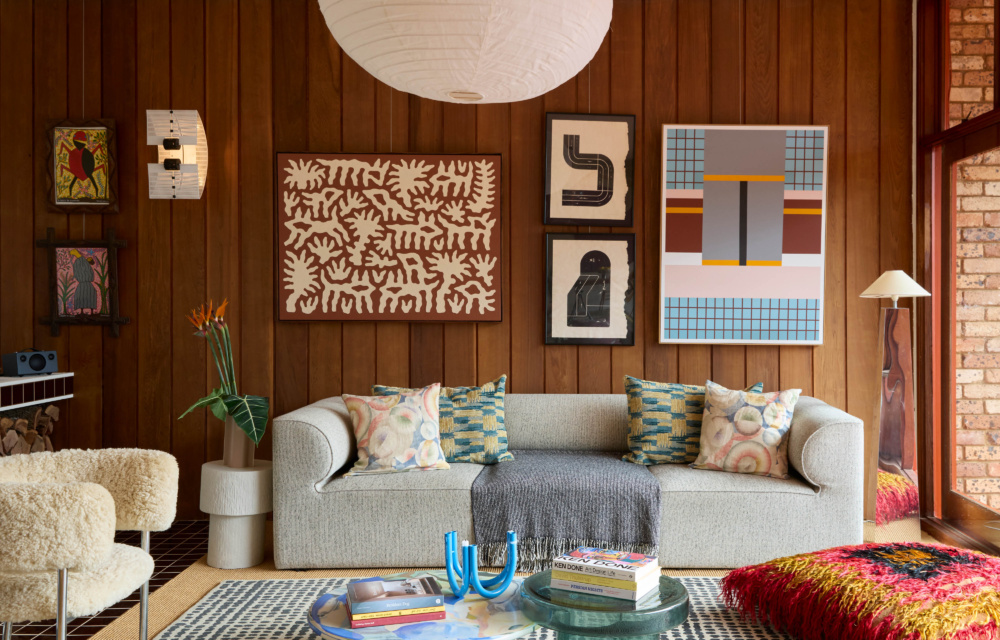 Wishbone Chair designed by Hans J. Wegner for Carl Hansen & Søn. Floor cushion by Uchronia. Custom cushion covers in Redelman Fabrics. Shogun Table Lamp designed by Mario Botta for Artemide. Chalice Bowl by Henry Holland. Art by Raelene Williams Ngala. Aalto Shelf by Andu Masebo. Sisal flooring. Rug by Cadrys. Modular lounge by Verpan. Triangle Leg Table and Bench by HAY. VP Globe pendant designed by Verner Panton for Verpan. Soda Coffee Table by Miniforms.