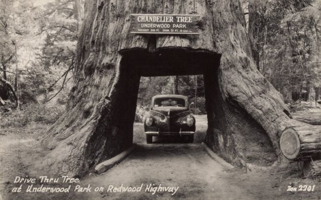 Drive through the Redwood Shrine tree at Myers, Redwood Highway