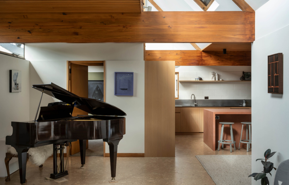 Painted concrete block, timber joinery, and cork flooring reference original detailing.