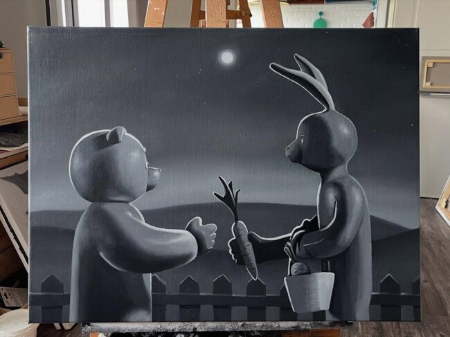 Starting to paint together in 2009 after one gifted the other a beginner’s art set, they developed a process where they first hand‑sculpt their characters in clay and then use these maquettes as references for oil paintings, drawings and animations. Their works often depict children, animals and toys—especially bears—in ambiguous situations that balance tenderness and unease, as in their ongoing series “The Bear got sick” and their book The Fox; this practice has brought them to exhibitions and fairs from Moscow and Europe to KIAF Seoul and Art OnO.