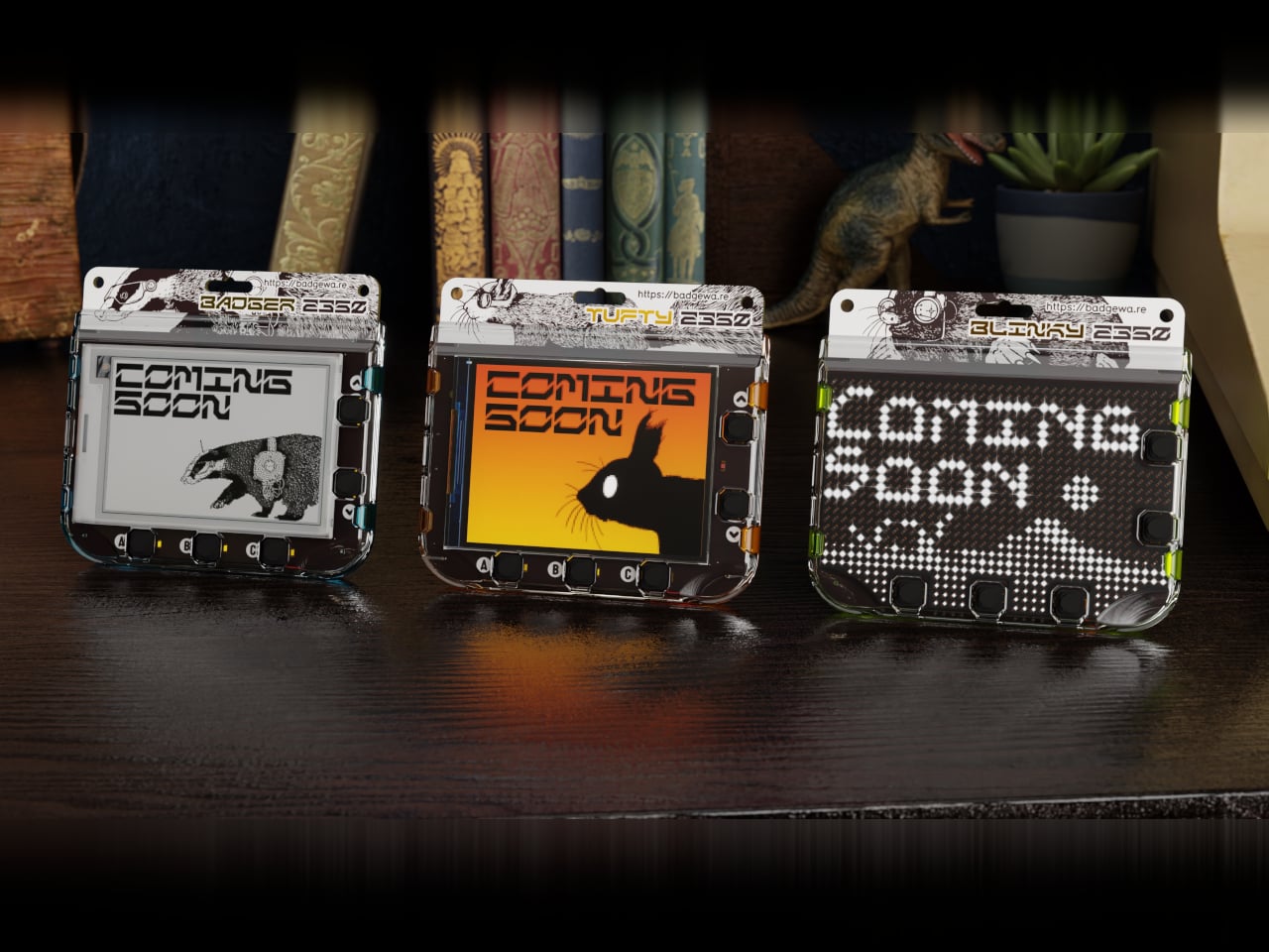 Badgeware is a family of wearable, programmable displays powered by Raspberry Pi’s new RP2350 chip. The trio gets names and personalities, Badger with a 2.7 inch e‑paper screen, Tufty with a 2.8 inch full colour IPS display, and Blinky with a 3.6 inch grid of 872 white LEDs. Translucent polycarbonate shells in teal, orange, and lime glow softly when the rear lighting kicks in, making them look like finished toys instead of bare dev boards.