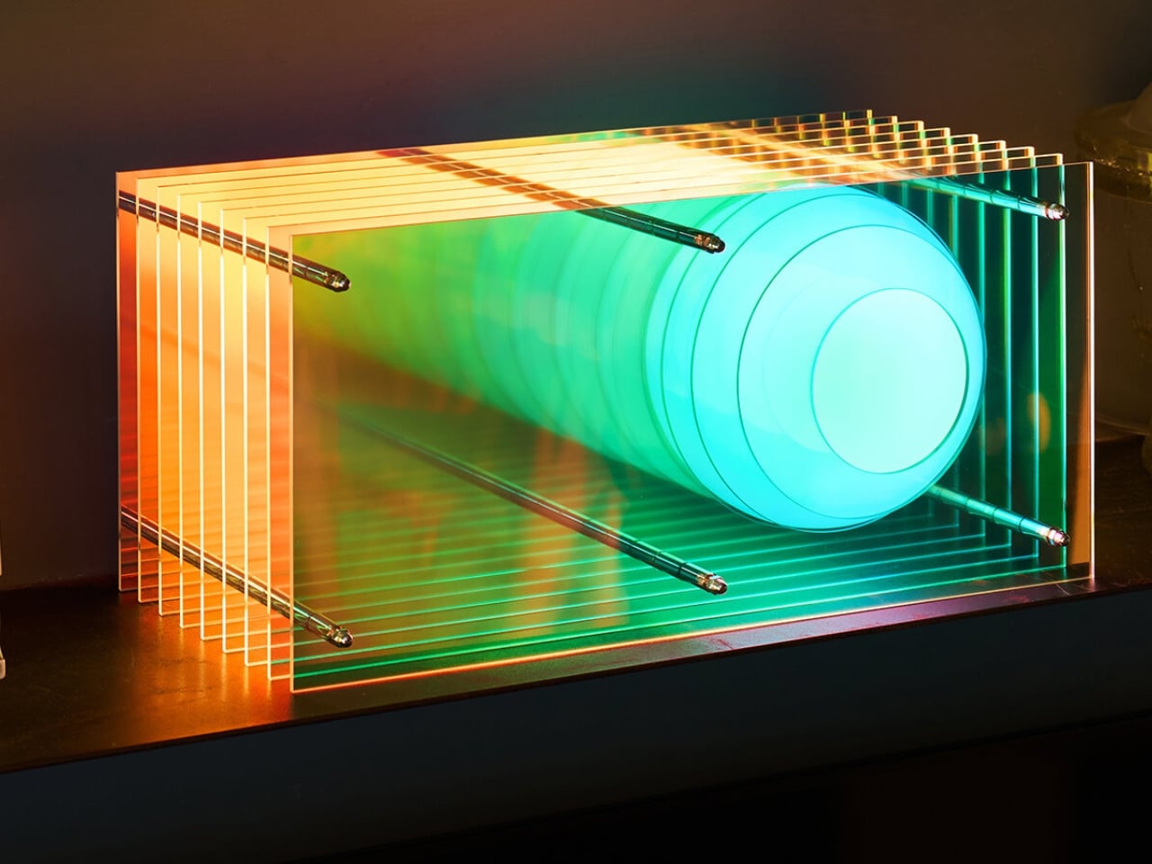 The Dreamy iteration introduces dichroic acrylic into the mix, and that single material choice changes everything. The lamp is built from precise layers of translucent acrylic sheets separated by polished inox spacers, creating consistent gaps that give the piece its signature rhythm and depth. At the center sits a matte opal glass sphere. When light hits the dichroic acrylic, the colors shift depending on your angle and the ambient light around it. One moment it reads as a cool blue. Move slightly and it blooms into warm gold or a soft green. The lamp isn’t just emitting light, it’s refracting it, filtering it, playing with it in a way that feels almost alive.