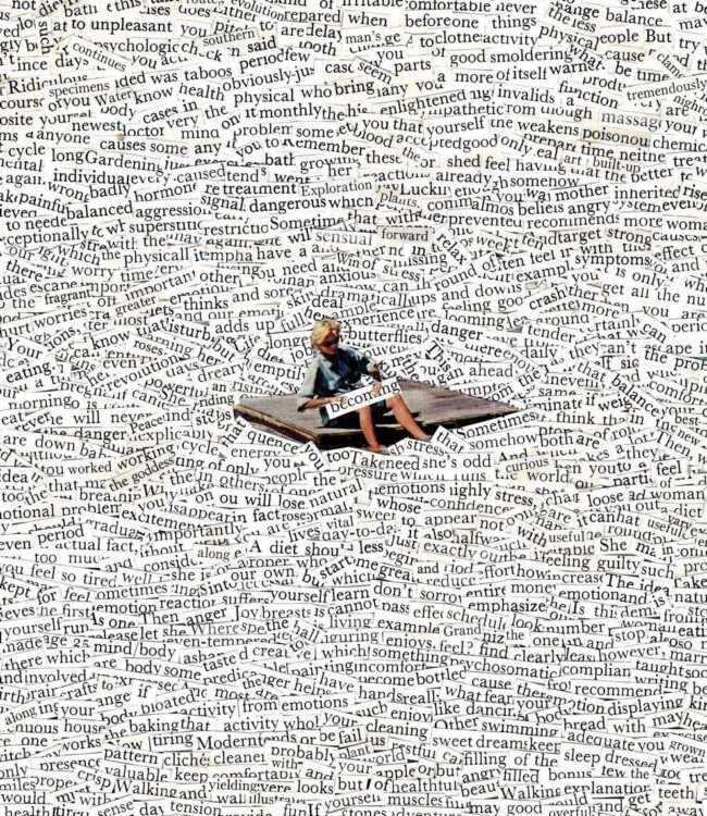 Goddard describes her artistic style as blending “Nostalgia & Whimsy,” crafting entirely analog collages using scissors, glue, and found imagery. She sources her materials from vintage magazines, old photography books, and thrifted media, which she meticulously cuts and rearranges to create surreal, dreamlike scenes. Her portfolio frequently explores the juxtaposition of human elements and vast natural landscapes, featuring recurring motifs like waterfalls seamlessly blending into domestic spaces, vintage figures adrift in starry skies, and playful plays on scale and perspective. Her work has been featured in international collage collectives and exhibited in local art shows, such as the Salón at the Parlour and the Papercuts exhibition.