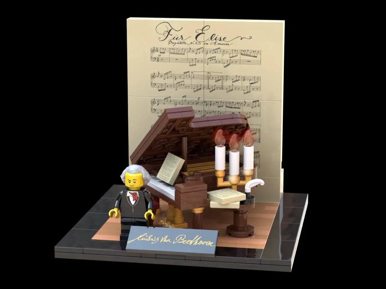 Fan designer CousinExcitedCactus has channeled that legacy into a 358-piece LEGO Ideas set timed to a significant milestone: March 26, 2027 marks the 200th anniversary of Beethoven’s passing. The result is a compact, modular display set with a grand piano, a Beethoven minifigure, a candlelit writing table, and a removable “Für Elise” sheet music backdrop, plus a surprisingly moving recreation of his grave monument in Vienna.