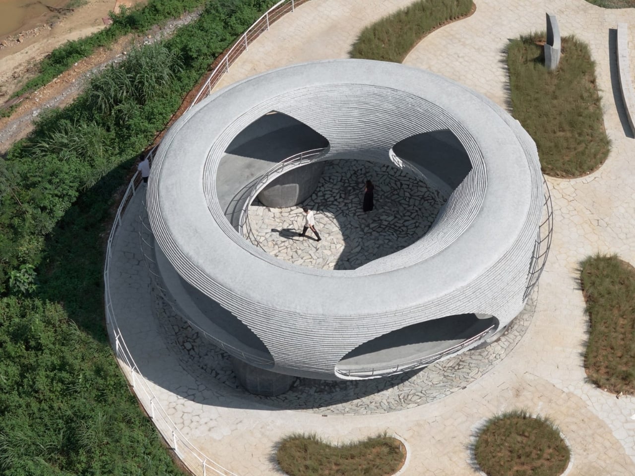 The structure itself is a continuous concrete ring, textured to mimic bamboo, that creates this mesmerizing circular journey. You enter, follow the curved path upward, and eventually circle back to where you started. But you’re not the same person who walked in. Because along the way, strategically placed oval openings frame the mountain ranges and river below like living paintings.
