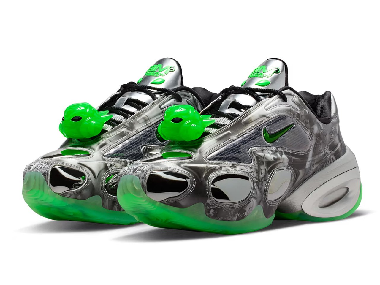 The Windowsen x Nike Air Max Muse is loaded with extraterrestrial symbols and visual cues, including an alien-head lace charm, and prints placed across the shoe upper. You can find two-toed alien footprints concealed on the insole and also discover them on the sole. If you love the idea of an outworldly sneaker, this is where your search should end. You can pick a pair in contrasting colorway options. The two colors include Metallic Silver/Black-Rage Green-White and Metallic Gold/Chili Red-Arora Green-Racer Blue, both complementing Nike’s youth culture approach.