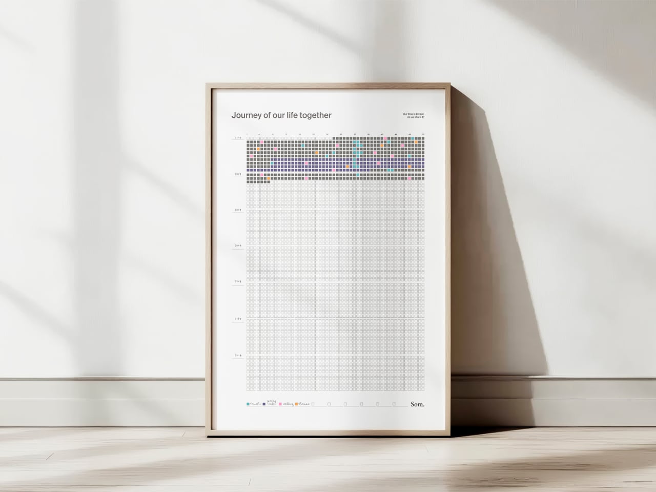 Weeks in a relationship or life blur together. You remember birthdays and trips, but the quiet in‑between time mostly stays invisible. We track deadlines and appointments on digital calendars, but rarely see the whole arc of a shared life at once, the years you’ve already moved through and the ones still sitting empty ahead. There’s something oddly powerful about seeing every week you have, and have had, laid out in one place on a wall.
