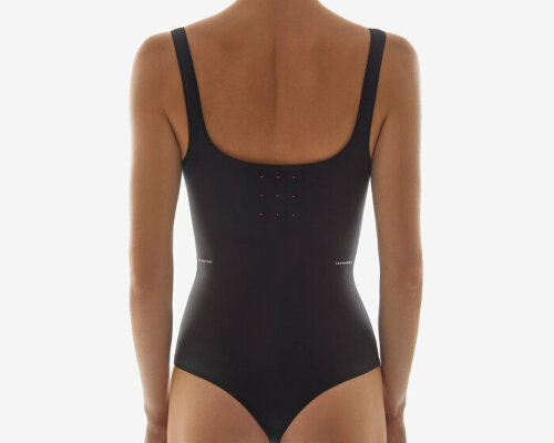 The C+ line includes a bodysuit, a top, and leggings, all of which are made using a biobased fabric that holds a special treatment called HeiQ Skin Care. This treatment was developed together with HeiQ, a textile technology company, by adding a mix of probiotics and prebiotics to the material. Probiotics are live microorganisms embedded into the regenerative C+ by Coperni, and prebiotics are nutrients that help those microorganisms grow.