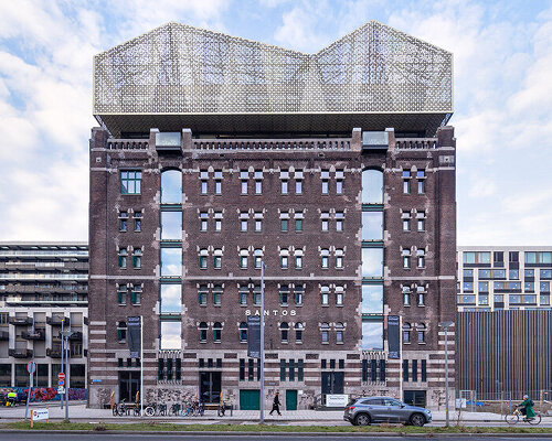 Constructed by Rotterdam architects J.P. Stok Wzn and J.J. Kanters, the Santos warehouse stands as a rare, well-preserved example of early 20th-century port architecture in the Netherlands. Listed as a national monument since 2000, it now integrates contemporary interventions, including a new atrium and a perforated aluminum ‘crown’ that accommodates offices, a restaurant, and short-stay apartments. The transformation, led by Rotterdam-based WDJArchitecten in collaboration with Hamburg studio Renner Hainke Wirth Zirn, equips the listed monument with advanced conservation facilities while retaining its industrial gravitas.