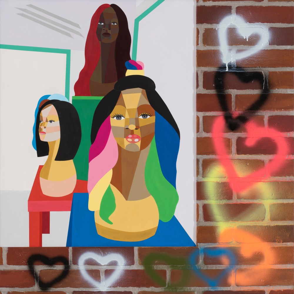 Acrylic, spray paint, and HDF faux brick on wood panel