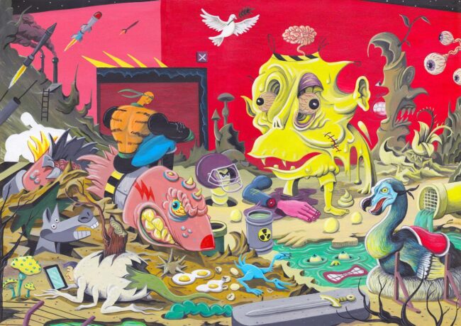 Brecht Vandenbroucke is a Belgian illustrator, painter, comic author, and filmmaker born in 1986 in Veurne, who studied illustration at Sint-Lukas University College of Art and Design in Brussels and now lives in Antwerp, where his satirical works critique modern society through vibrant, pop culture-infused visuals.