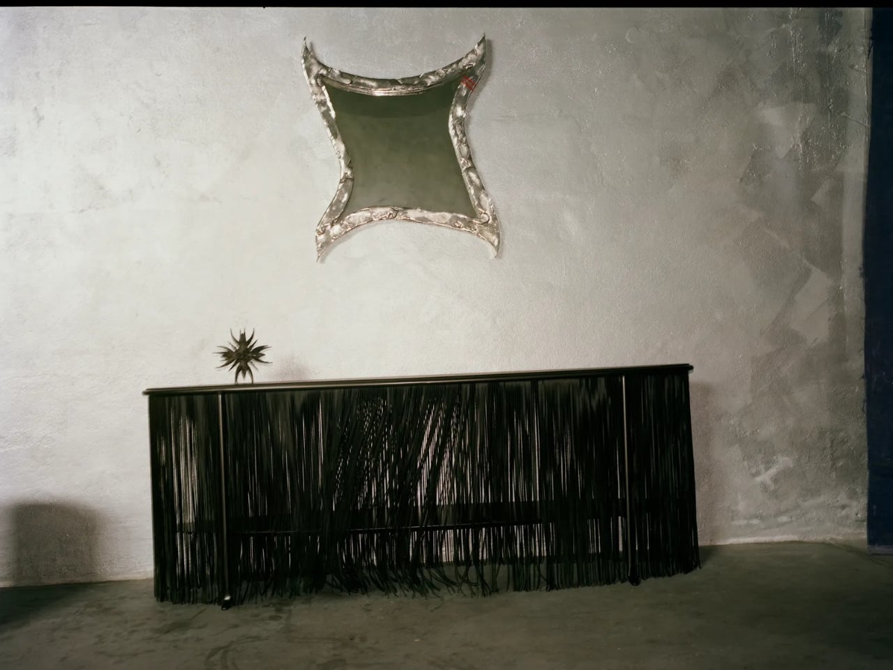 The collection itself is three pieces: a console, a coffee table, and a side table. All three are built with taut leather surfaces and rounded steel rod edges, and all three trail floor-length leather tassels that move with a life of their own. The tassels are the thing that catch your eye first, and they’re meant to. They pull from African drums, from African ceremonial dress, and from the fringed leather jackets of Texas cowboy culture. That last reference might seem like an odd pairing, but that’s kind of the point. Kanu isn’t choosing between his influences. He’s letting them coexist.
