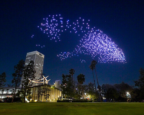DRIFT has released Franchise Freedom, its illuminated flock of dancing drones, over the Los Angeles County Museum of Art (LACMA), to mark the opening of the Peter Zumthor-designed David Geffen Galleries in Los Angeles.