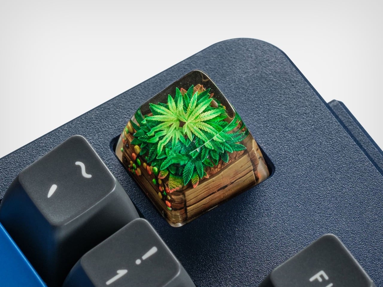 The countdown to 4/20 has begun, and if you’re the type who celebrates by upgrading your workspace aesthetics rather than raiding the nearest dispensary, Dwarf Factory sees you. The Vietnamese artisan keycap maker has built a reputation for encasing impossibly detailed miniature scenes in resin, transforming individual keyboard keys into tiny dioramas. Their Terrarium V2 collection has featured everything from succulents to seasonal florals, each one hand-painted and assembled at a scale that borders on obsessive. Their latest drop leans into the holiday with zero subtlety and maximum craft.