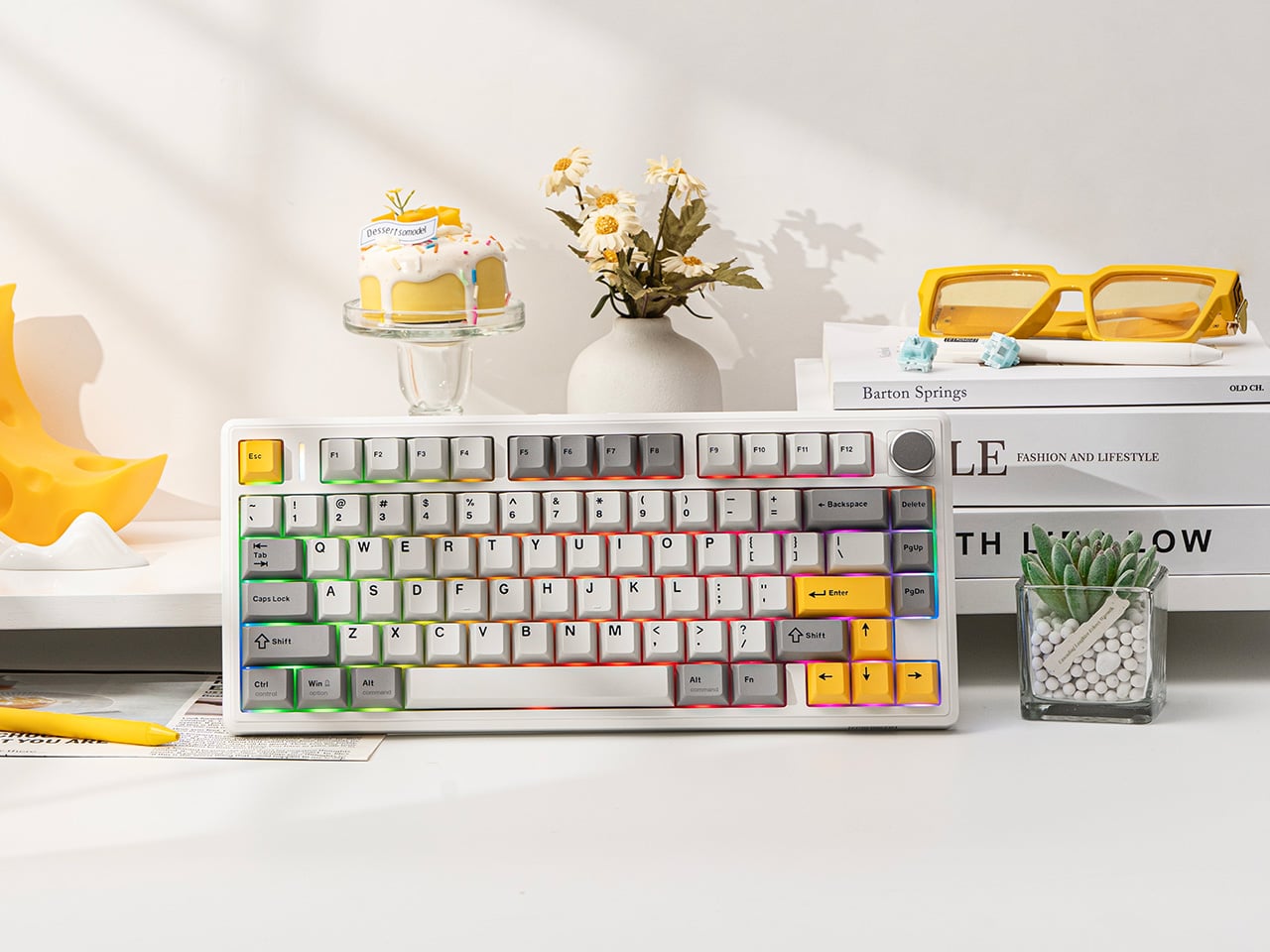 Picking between the two is a fairly straightforward exercise in priorities. The TH80 V2 covers the gasket mount, the massive battery, hot-swappable switches, full per-key RGB, and a side-lighting bar, available in a subtle Black Grey or a composed White Grey Yellow. The TH80 V2 Pro adds the LCD screen, the larger battery, the browser-based driver, and more expressive colorways, including a striking translucent black and a fan-favorite Pink edition.
