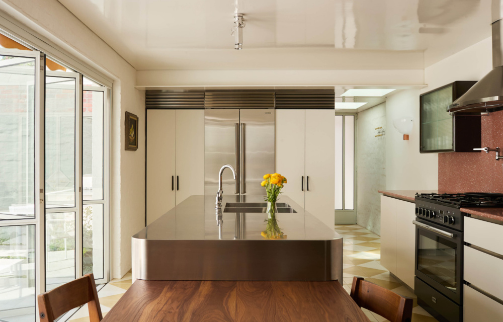 In the kitchen, the contemporary stainless steel island contrasts with the home’s Victorian ornamentation while helping to bounce light deeper into the terrace footprint.