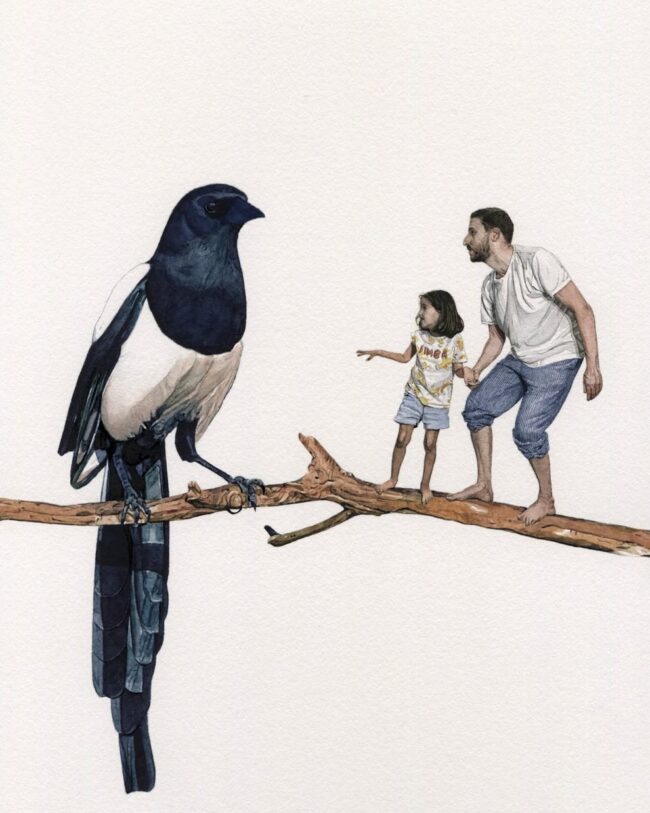 Fabien Mérelle (b. 1981, Fontenay-aux-Roses) masters ink and watercolor with Eastern finesse from Xi’an studies and Dürer-like precision from Paris Beaux-Arts, portraying pyjama-clad figures in dreamlike family scenes of vulnerability, transformation, absurdity, and subtle psychological irony.