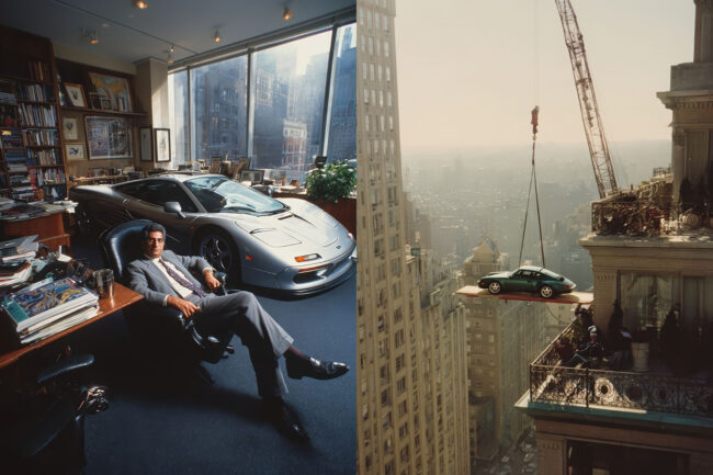This series is framed as a lost archive of 1990s Wall Street excess: Ferraris, Lamborghinis, and Porsches displayed inside offices, boardrooms, and penthouses like status objects rather than cars.