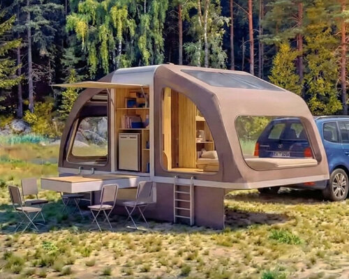 Meet Wingcube, a foldable tent box that transforms from a wooden cabinet-like structure into a wing-looking mobile shelter. Combining the structure of a tent with the concept of a compact cabin, the project, which is till in development, focuses on being modular so users can transport it anywhere with their vehicles. It can be towed easily, and once it finds its spot, the structure extends outward like a fan, creating a raised mini cabin.