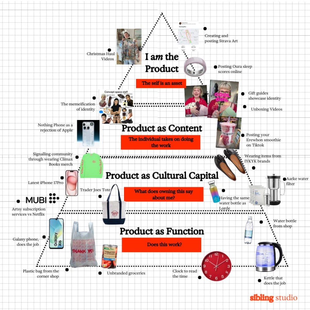 Interestingly, this evolution is not linnear. As brands move up the pyramid, abstracting themselves into values, worlds, and cultural posture, individuals are pushed in the opposite direction, down into labour. The work of meaning-making, distribution, and identity signalling increasingly falls on the person rather than the company. Brands become lighter, more conceptual, more removed; people become the infrastructure through which those brands are activated, circulated, and made legible.