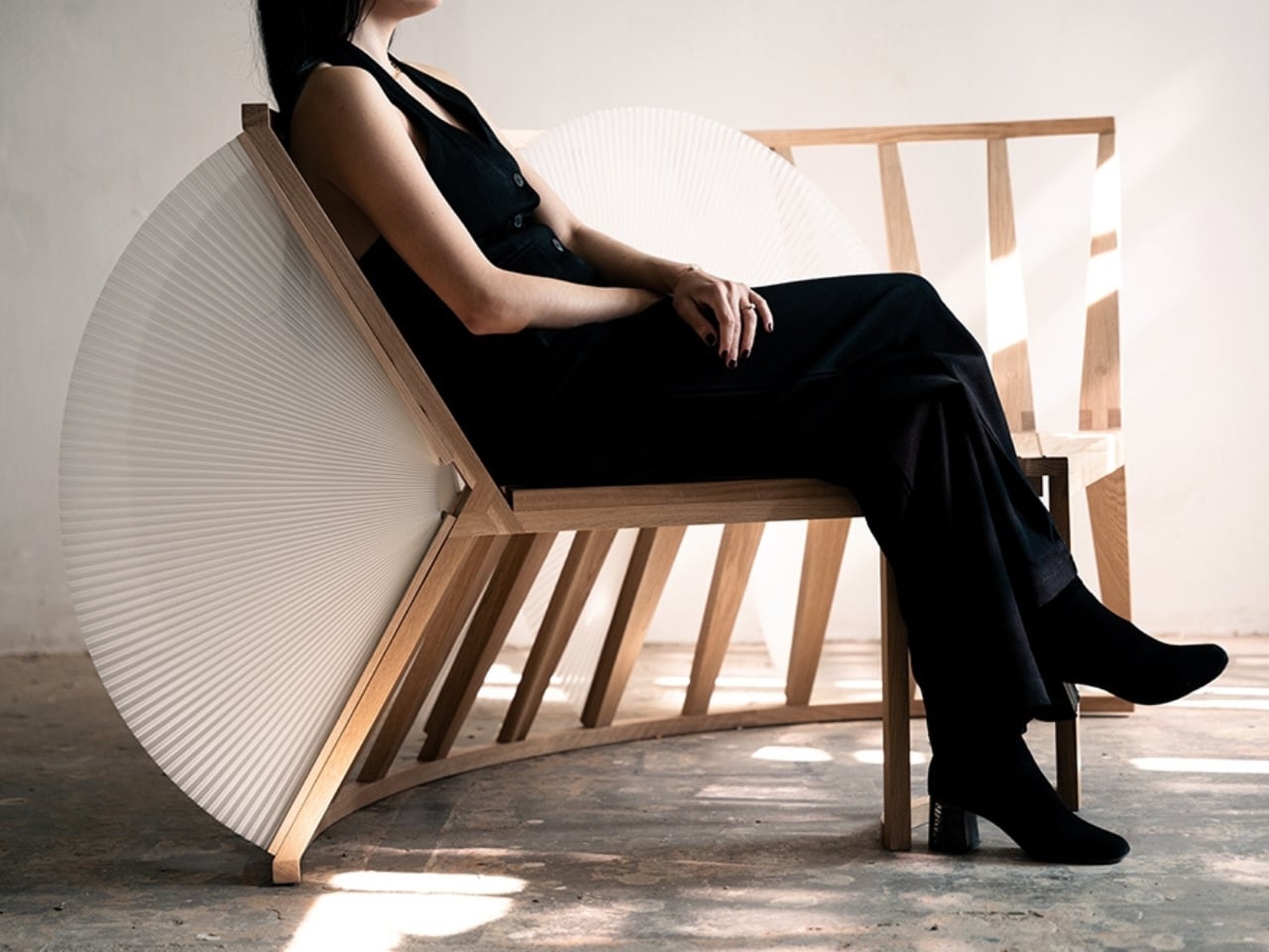 Picture this: a chair that unfolds like a Chinese paper fan, its pleated form spreading out in a graceful arc. That’s the essence of the Moon Series, designed by Christina Standaloft and Jay Jordan. The collection features two core pieces, the Moon Chair at 60 degrees and the Moon Bench at 120 degrees, both built on radial geometry that gives them this incredibly sculptural quality.