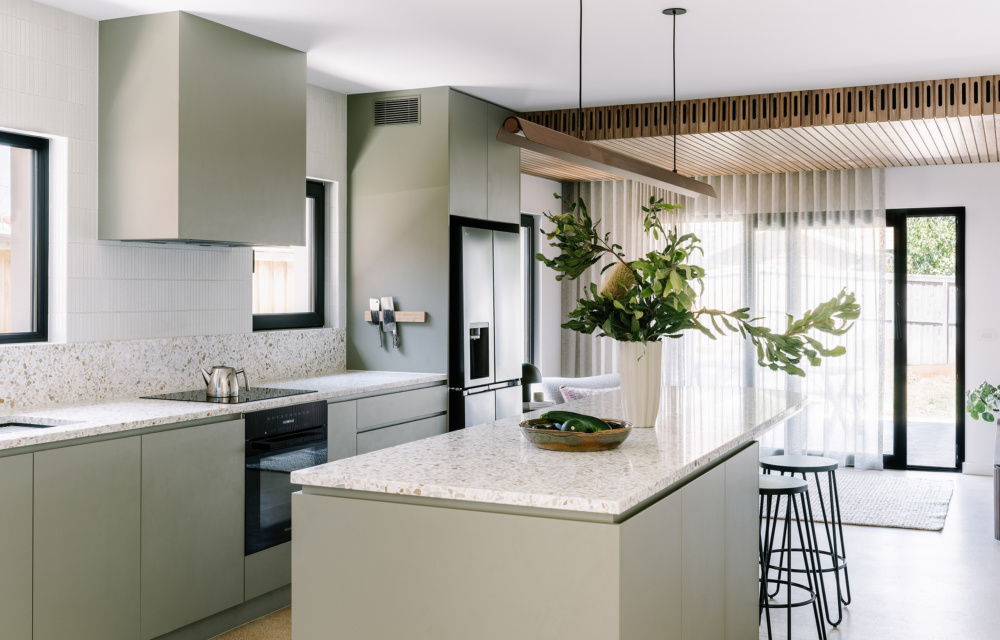 The interior palette also served to ground the home in nature, embracing natural or reclaimed materials throughout. Blackbutt timber lining meets cork flooring, while terrazzo and green joinery echoes calming hues in both the kitchen and bathrooms.