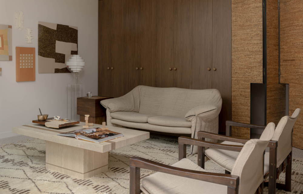 Wool rug by Armadillo. Le Stelle loveseat by Mario Bellini, designed in 1974 for B&B Italia. Pair of vintage Diana Safari Chairs by Karin Mobring for Ikea (1970) sourced via Facebook Marketplace. Italian travertine coffee table found via Facebook Marketplace. Tiled side table by Studio Blank. Vintage Lakene lamp designed by Brylle and Jacobsen for Ikea sourced via auction house Leonard Joel. All textile works on wall by Jarnah Montersino. Ceramic wall artworks by Jan Vogelpoel.