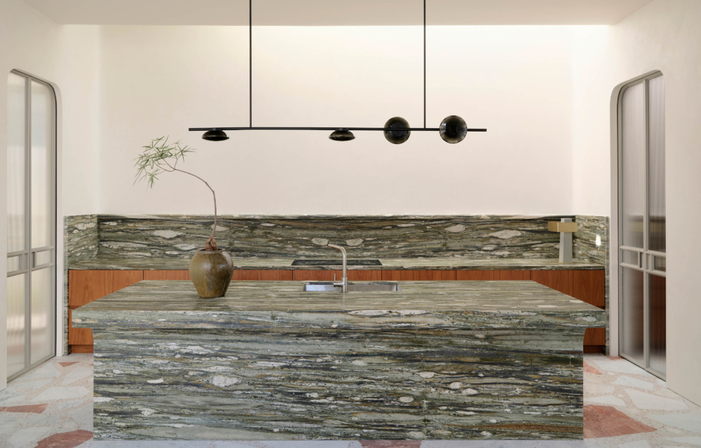 The striking kitchen inside Hopetoun Street by Freadman White. Verde Bardini stone splashback and island bench.