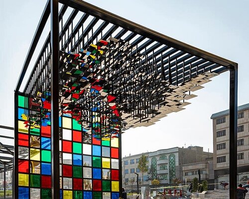 Commissioned in 2020 by Mashhad Municipality, the pavilion is located within a former Coca-Cola factory in Mashhad, now repurposed as an innovation hub. The intervention occupies a cubic void within a larger pyramidal hypostyle hall, formed by the absence of a structural module. The design responds to this context by introducing a self-supporting cubic structure that establishes a clear spatial distinction from the surrounding early modernist framework.
