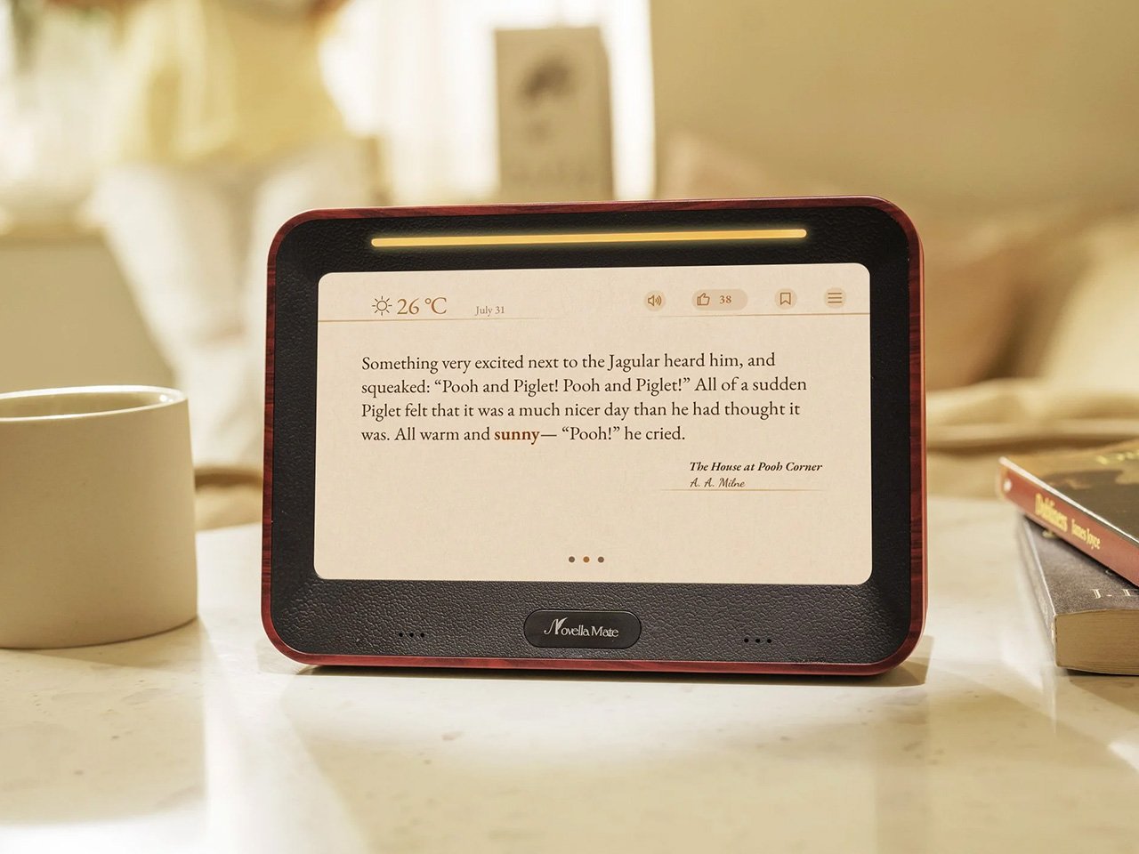 Unlike most smart displays that shout information at you, NovellaMate leans into subtlety. The time and weather are presented through literature, either displayed in text or read aloud in a voice that’s designed to feel more like a friend sharing a favorite passage than a robot reciting data. The audio is paired with soft, adaptive lighting and ambient music, creating a wake-up routine that’s closer to a sunrise than an alarm. NovellaMate compares it to being nudged awake by a particularly thoughtful librarian, which, let’s be honest, is a vibe we could all use more of. The physical design reinforces this ethos: walnut grain, vegan leather, a warm glow that acts as an earthy antithesis to the plastic, glass, and metal boxes we associate with IoT devices today.