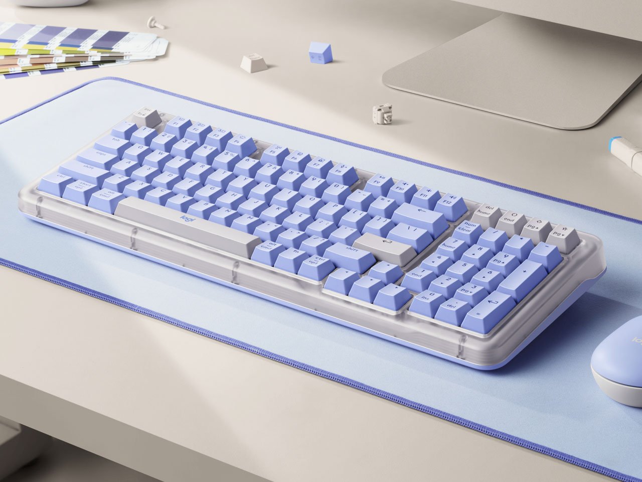 The K98M uses a compact 98-key or “1800-style” layout that retains the number pad and full arrow key cluster while saving desk space compared to standard full-size keyboards. The translucent upper shell paired with a color-matched base, available in graphite, off-white, or lilac