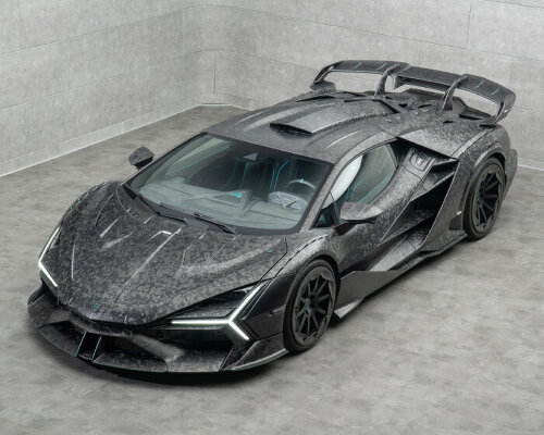 The post modified car made of baked carbon fiber drives with triangular tailpipes and ‘scoop’ on roof appeared first on designboom | architecture & design magazine.