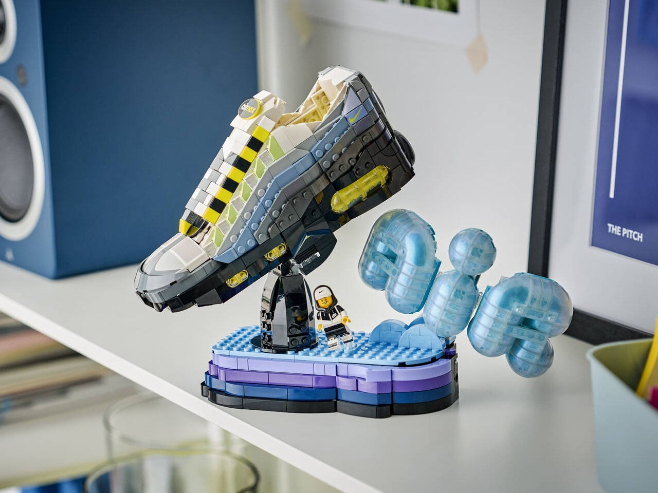 Comprising 1,213 pieces, the LEGO set complements the LEGO-themed Air Max 95 sneaker we talked about earlier. The signature grey gradient, Air bubbles, and the contrasting neon yellow and green inserts on the sides come to life as the LEGO set is pieced together. The brick-built model faithfully recreates the sculpted midsole and the signature wavy upper that made the original sneaker instantly recognizable. LEGO also includes a Nike-branded minifigure to reinforce the playful crossover between sneaker culture and brick-building. Once you put it together, the sneaker measures roughly 9 x 12 x 7 inches and can be displayed on the rotating stand or simply put on the prime desk spot to celebrate the brand’s success with high-top and low-top Dunk sneakers. The build also features a brick-built ‘AIR’ logo bubble, and the rotating display stand mimics the kind of pedestal sneaker collectors use to showcase prized pairs.