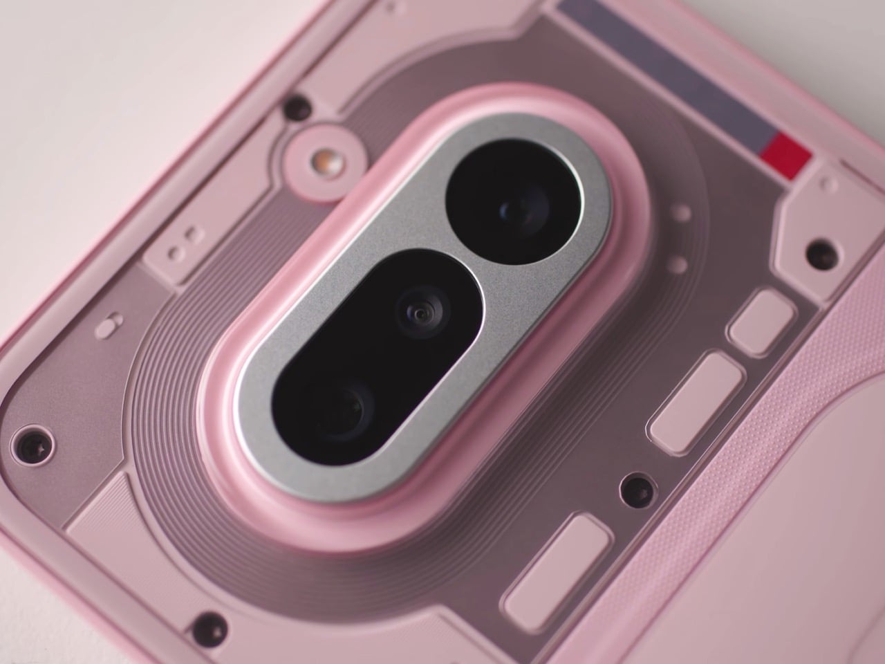 The pink is the first thing people will talk about, and most of them will get it slightly wrong. The phone reads pink, but the back panel is technically white. The color comes from tint layered inside the transparency, sitting between the glass and the resin underneath, which means the light has to travel through it before it bounces back to your eye. That gives it a depth and a luminosity that solid paint physically cannot produce. Nothing’s designers described it as starting with the resin being nearly identical to white, then adding a small amount of tint, then letting the tinted glass layer do the heavy lifting. The result shifts depending on the light you’re standing in, giving you a phone that changes ever so slightly in different lighting scenarios. It’s clever, considering Nothing’s done this in the past by playing with depth, relying on textures and components casting unique shadows based on the light source. Now, the company’s adding color to that formula.