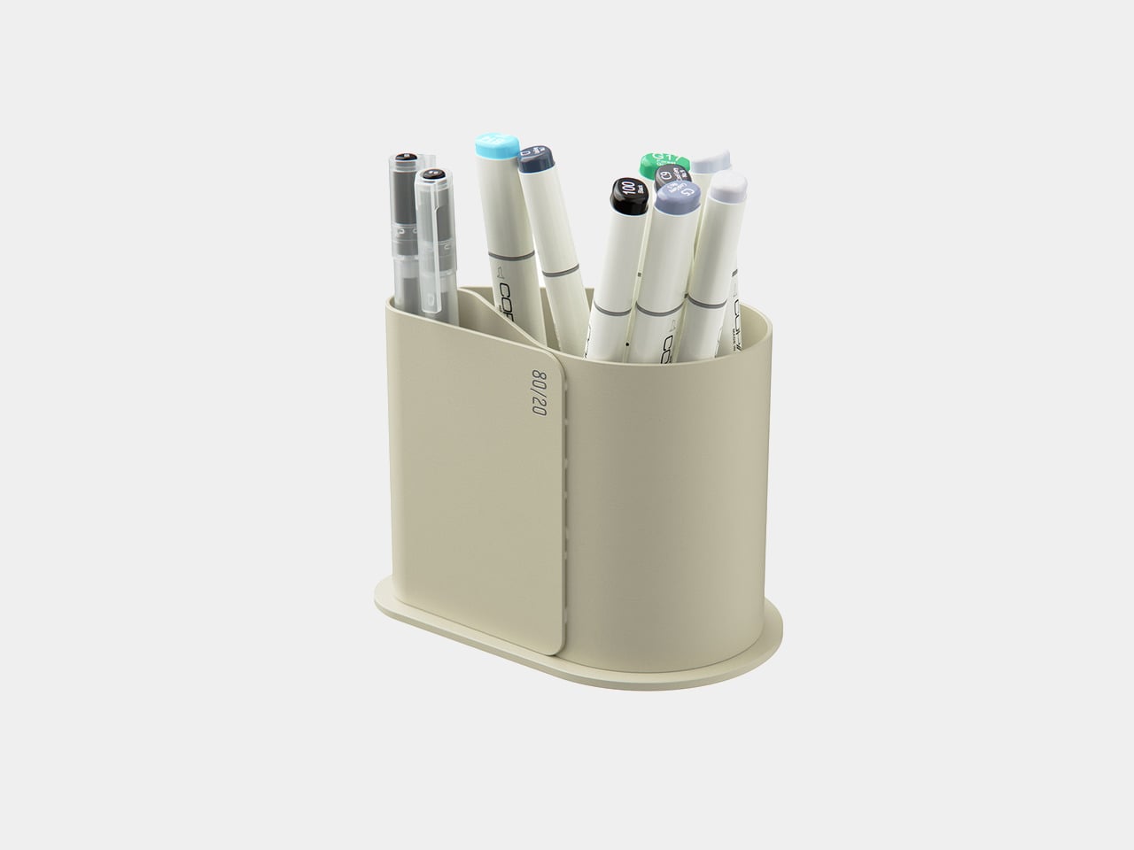 A small “80/20” mark on the side acts as a quiet nod to the idea driving the form, not a loud logo. It is a reminder that the pot is not just another cylinder; it is a physical diagram of how most of us actually work, a big space for the few tools that matter most, and a smaller one for everything else.