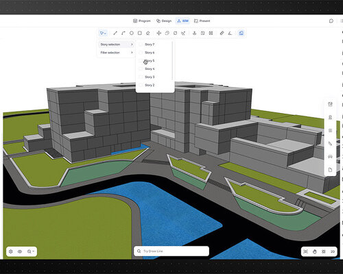 Among the emerging platforms, Snaptrude has stood out for integrating AI directly into the early phases of design. Unlike software that requires the manual construction of masses or layouts, the tool allows a project to begin from textual descriptions, simply indicate building type, site, and program, and the system generates an initial spatial proposal.