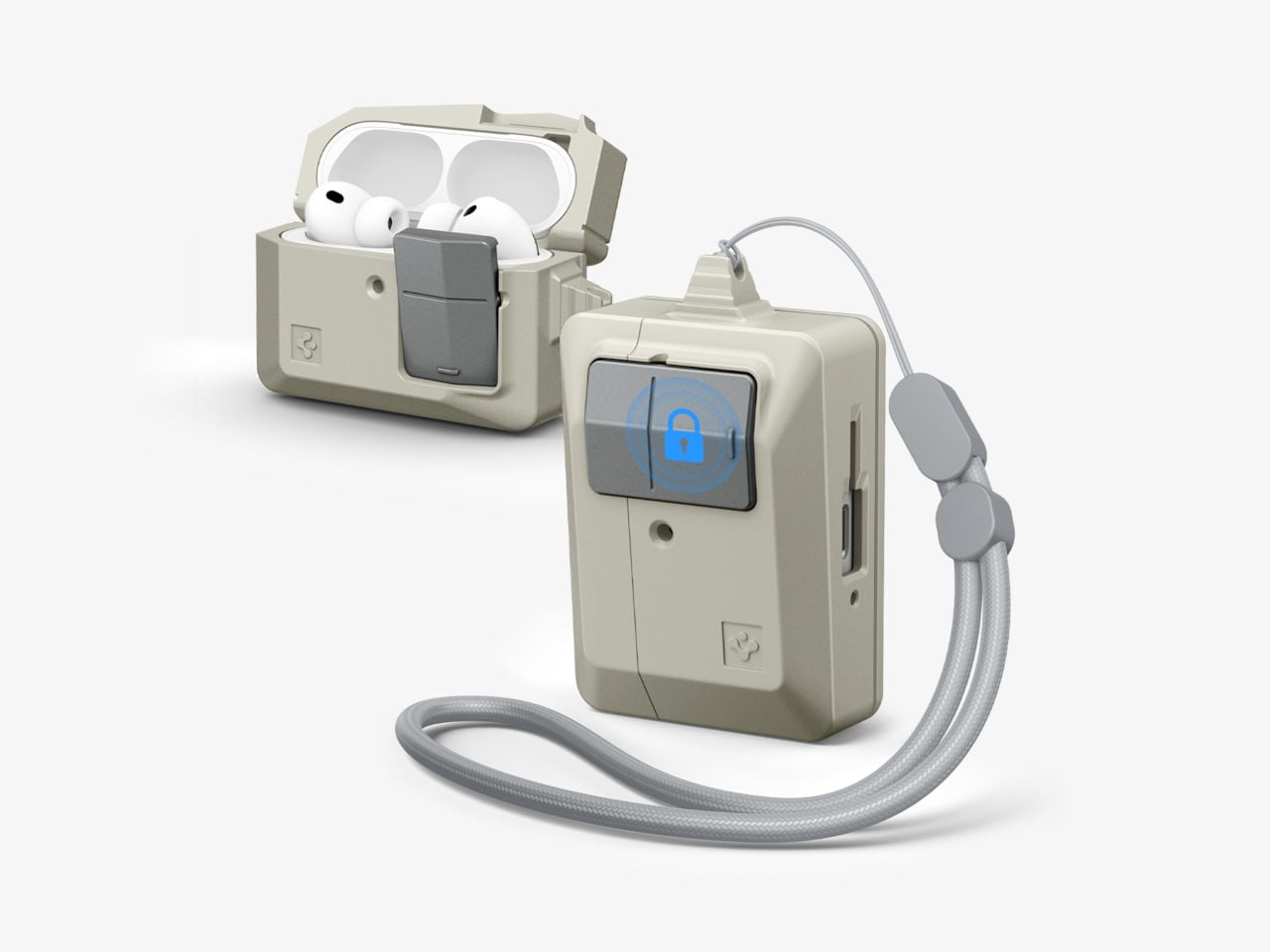 The case borrows the mouse’s proportions, its warm stone-colored plastic, and its most tactile feature. Spigen built a “Push to Unlock” locking mechanism into the front, positioned where the mouse button would have been. Press it and the hinged lid releases; snap it shut, and it clicks back into place. It’s a small mechanical gesture, but it makes opening and closing feel deliberate rather than accidental.